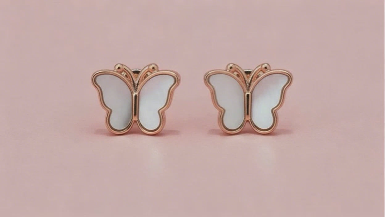 Add a touch of elegance and charm to your everyday look with these beautifully crafted 925 Sterling Silver Butterfly Stud Earrings. Designed in a delicate butterfly silhouette, these earrings feature a smooth white enamel inlay framed by a polished rose-gold–tone finish, creating a refined yet playful aesthetic.