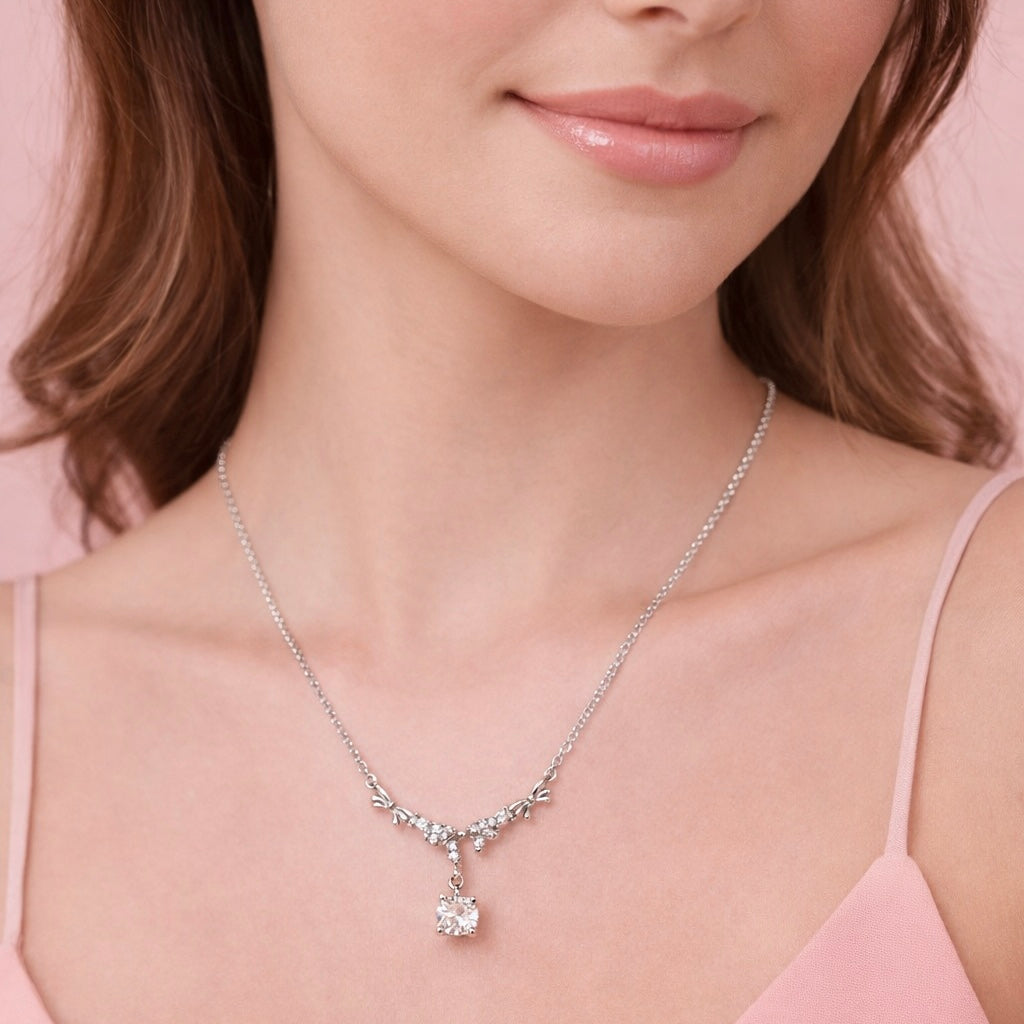 Refined elegance meets contemporary craftsmanship in this GlitzHeaven 925 Sterling Silver Pendant Necklace. Designed with a graceful leaf-inspired motif, the pendant features finely set shimmering cubic zirconia stones that flow into a brilliant square-cut drop stone, creating a sophisticated and eye-catching silhouette.